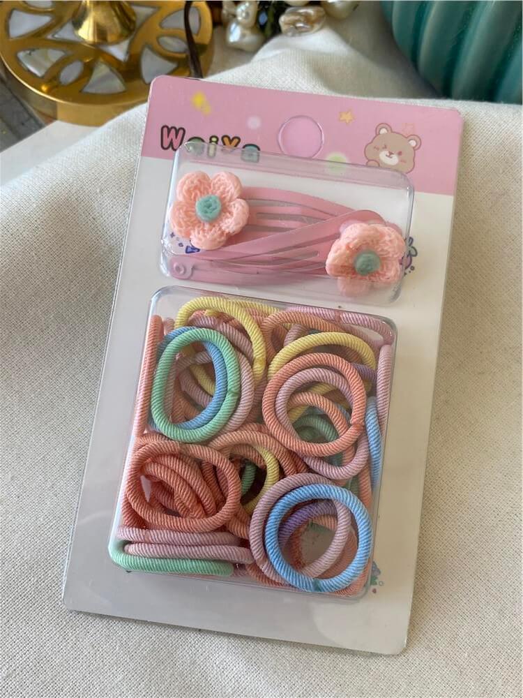 Moda LUKKA - Çıtçıtlı Açık Pembe Çiçek Detaylı Renkli Mini Lastik Toka Seti