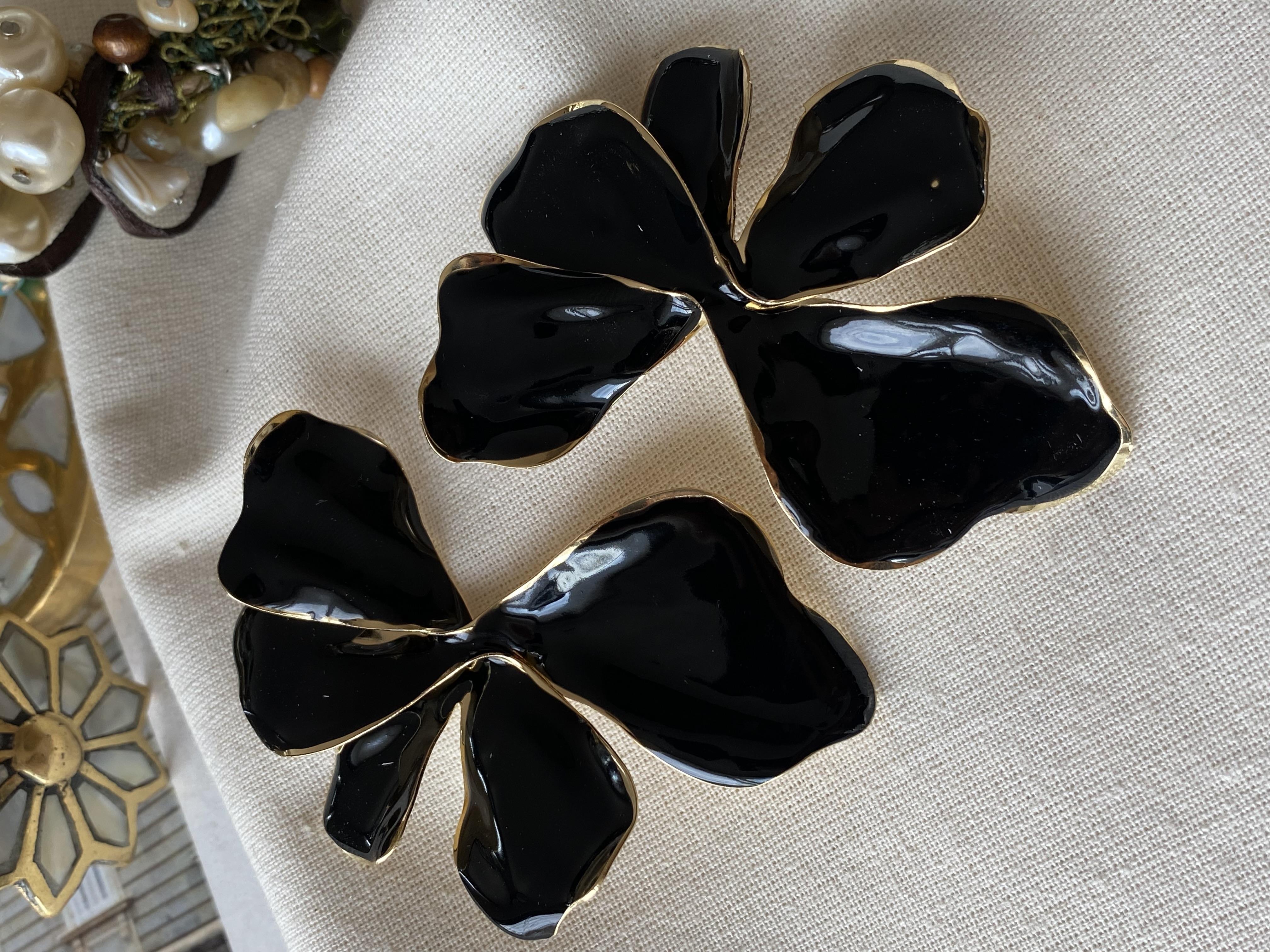 Gold Detaylı Siyah Mineli Büyük Yaprak Küpe (30707)