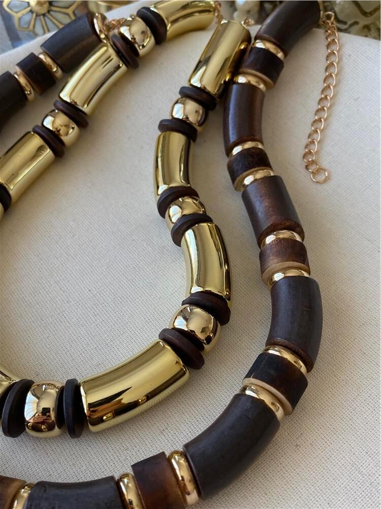 İkili Gold Plaka Detaylı Tahta Kolye (31772)