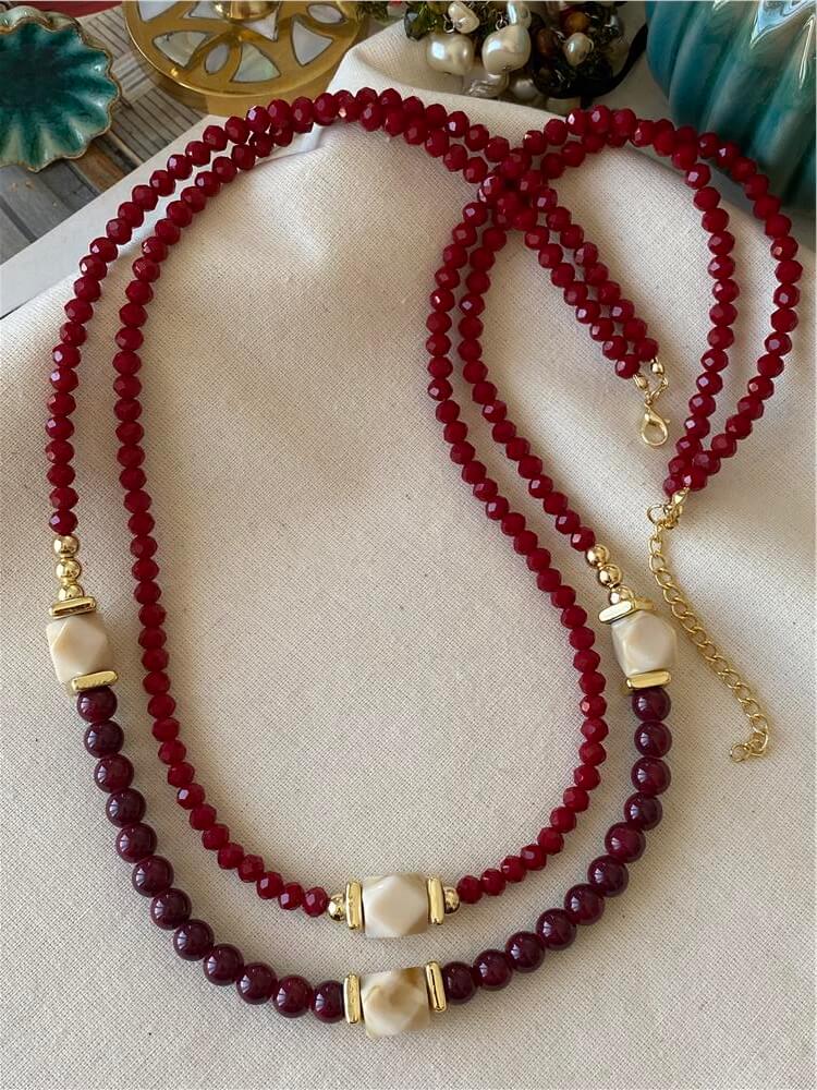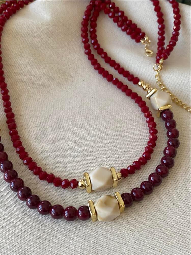 İkili Krem Taş Detaylı Bordo Boncuk Kolye (31546)
