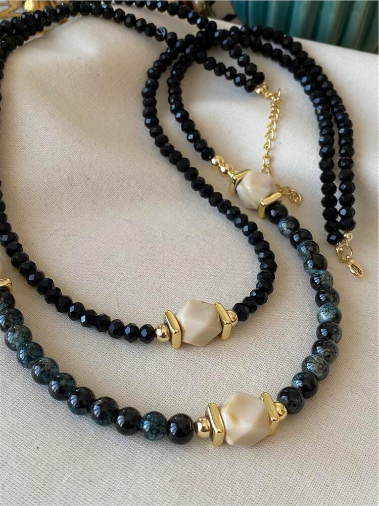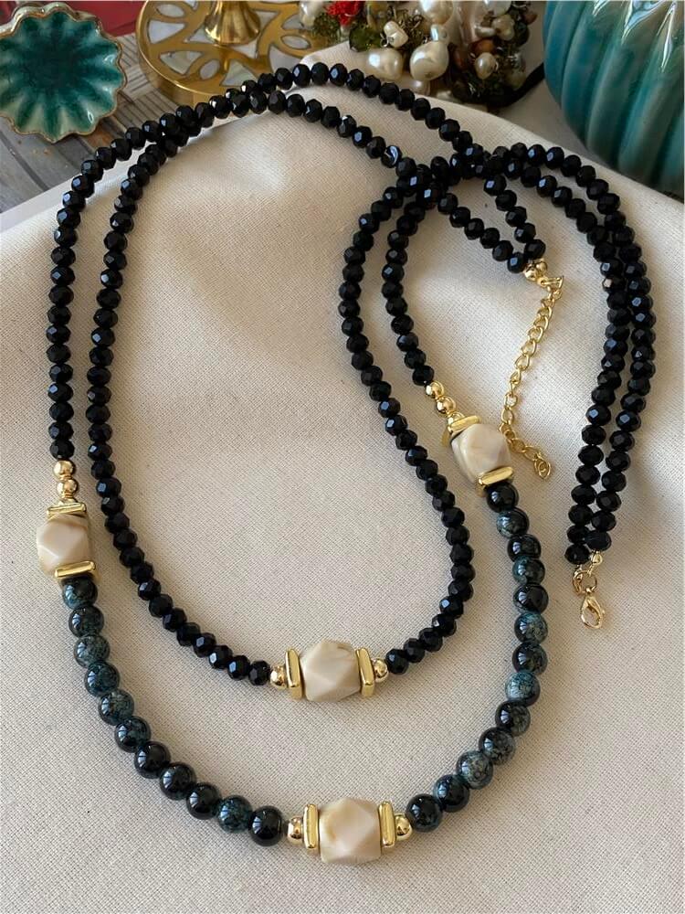 İkili Krem Taş Detaylı Siyah Boncuk Kolye (31545)