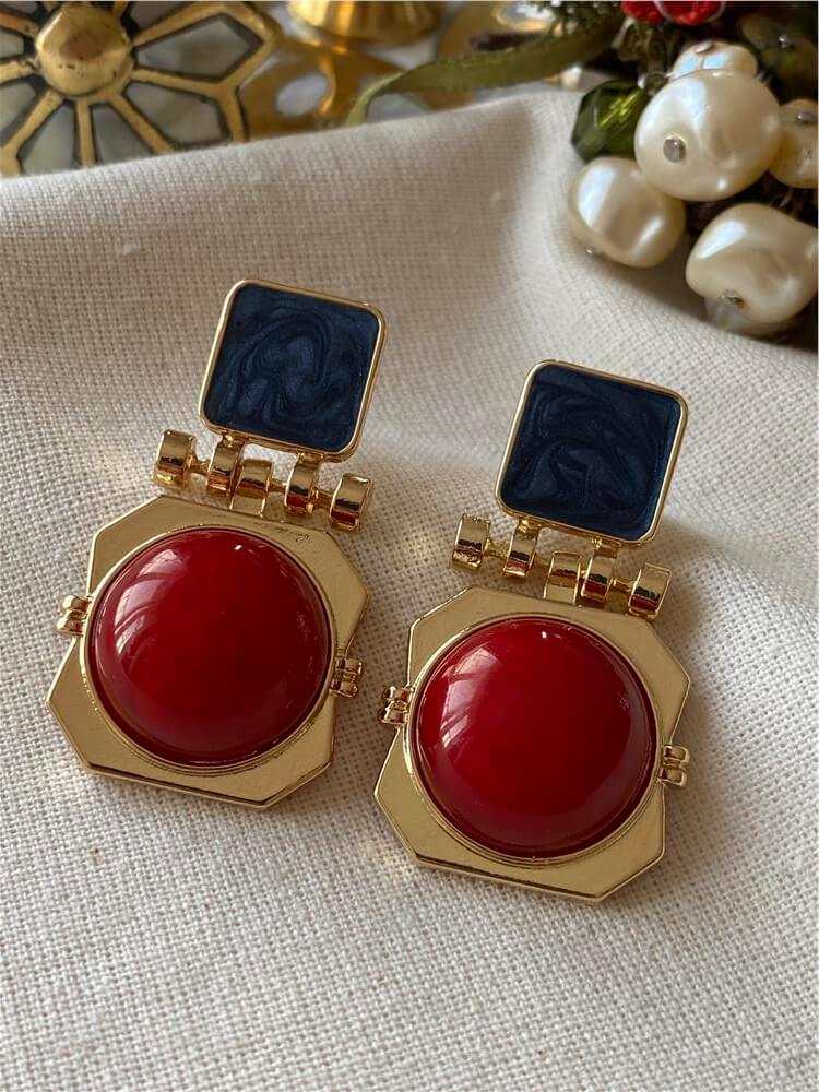 Moda LUKKA - Lacivert Mineli Kırmızı Taşlı Kare Model Küpe