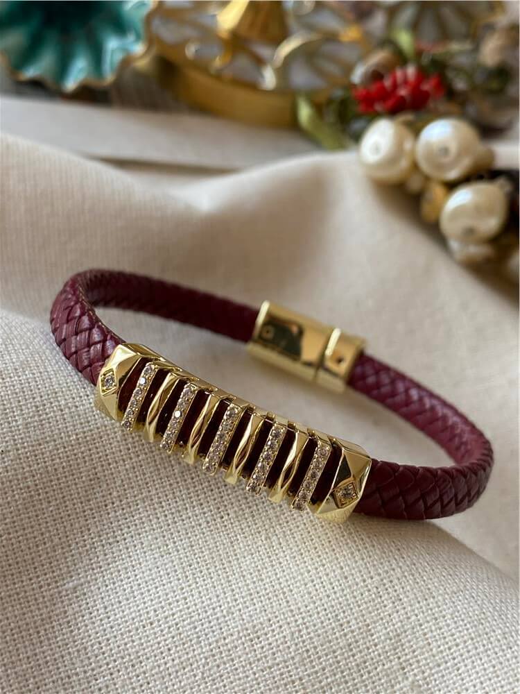 Taşlı Plaka Detaylı Bordo Mıknatıslı Deri Bileklik (31561)