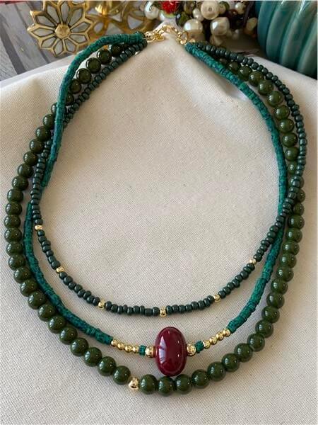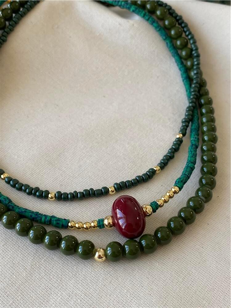 Üçlü Bordo Büyük Taş Detaylı Yeşil Boncuk Kolye (31553)