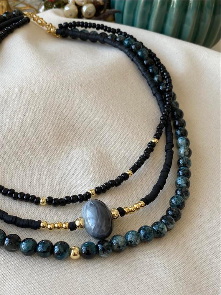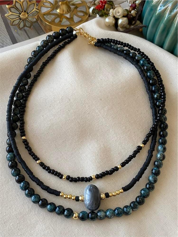 Üçlü Büyük Taş Detaylı Siyah Boncuk Kolye (31552)