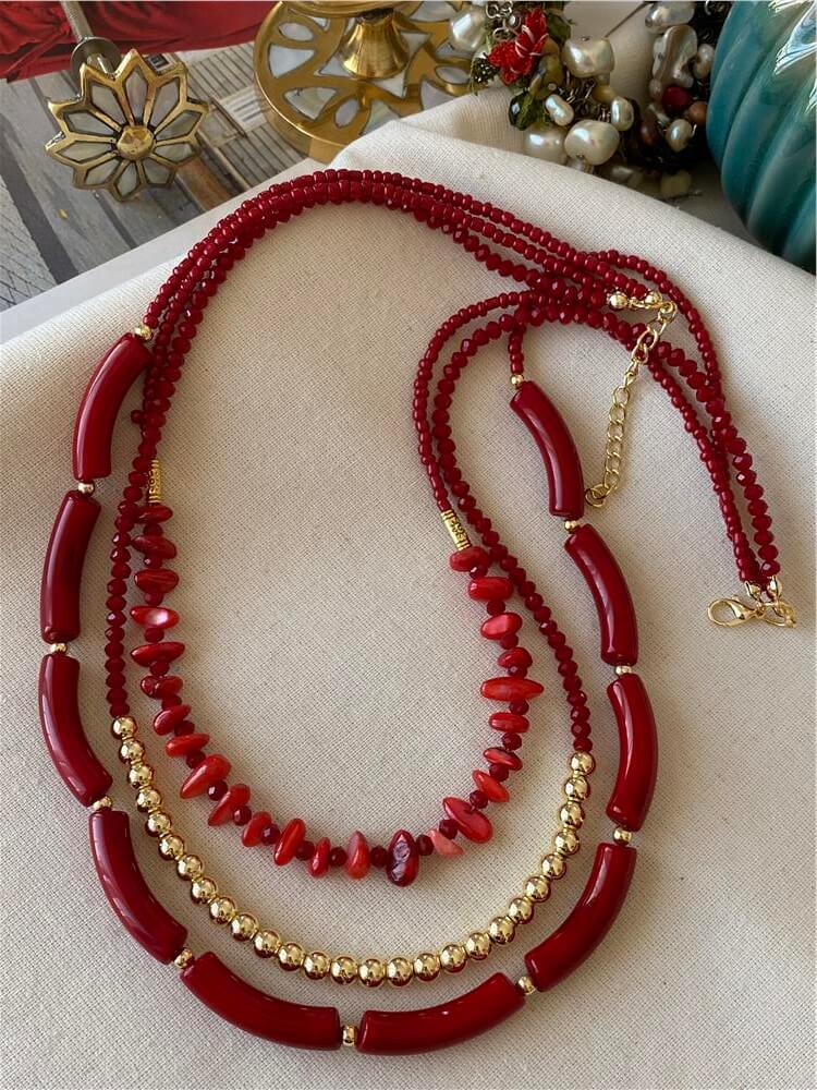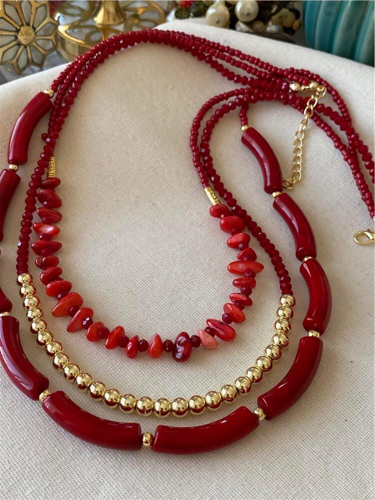 Üçlü Dorika Detaylı Kırmızı Zarif Kolye (31550)