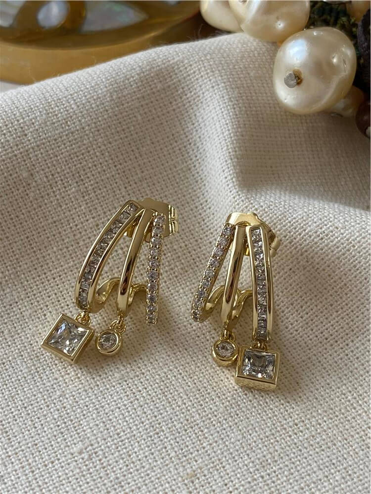 Moda LUKKA - VIP 14K Kare ve Yuvarlark Taş Sallantılı Kaburga Küpe
