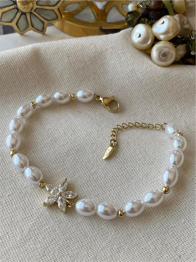 Moda LUKKA - VIP 14K Taşlı Çiçek Detaylı İnci Bileklik