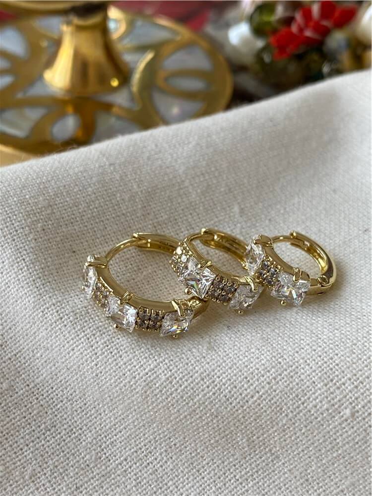 Moda LUKKA - VIP Üçlü 14K Kare Taşlı Küt Halka Küpe Seti