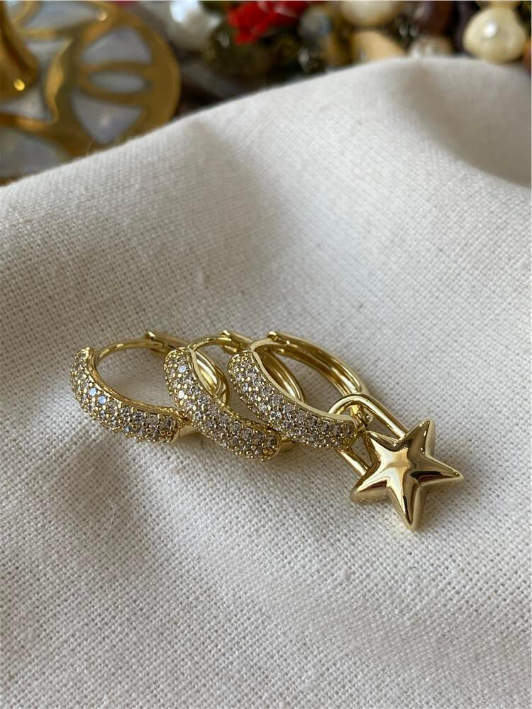 Moda LUKKA - VIP Üçlü 14K Yıldız Sallantılı Taşlı Bombe Küpe Seti